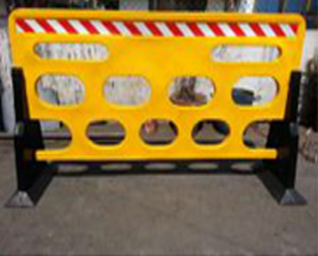 Road Barriers made from LLDPE UV Stabilised Plastic. It is 3 Pc Construction of Size – 2000 mm L x 1200 mm H x 500 mm base Width Red/Yellow (Not Interlocking ) With Reflective Stickers. Weight -13 Kg. it has Option to fill Sand in both the Legs & With Display Area